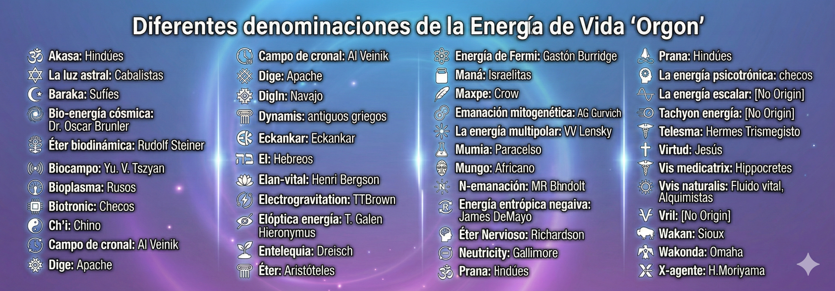 Aquí tienes la lista completa de las denominaciones de la Energía de Vida (Orgón) con una simbología representativa para cada una, manteniendo la esencia de lo que diseñamos anteriormente: